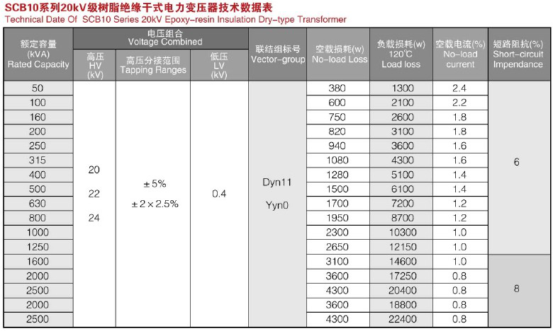 20kv级SCB10系列环氧树脂干式变压器技术参数: