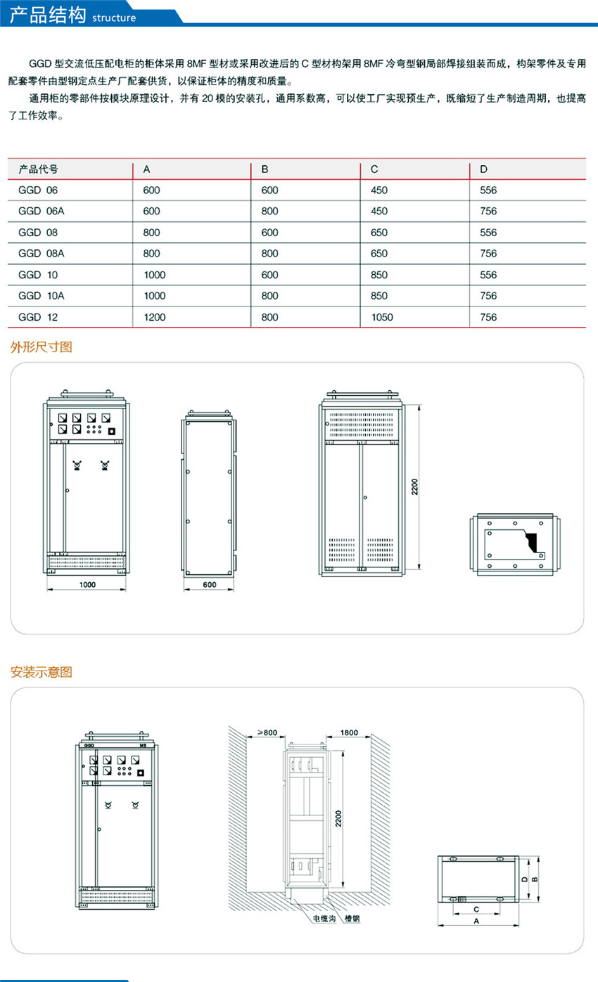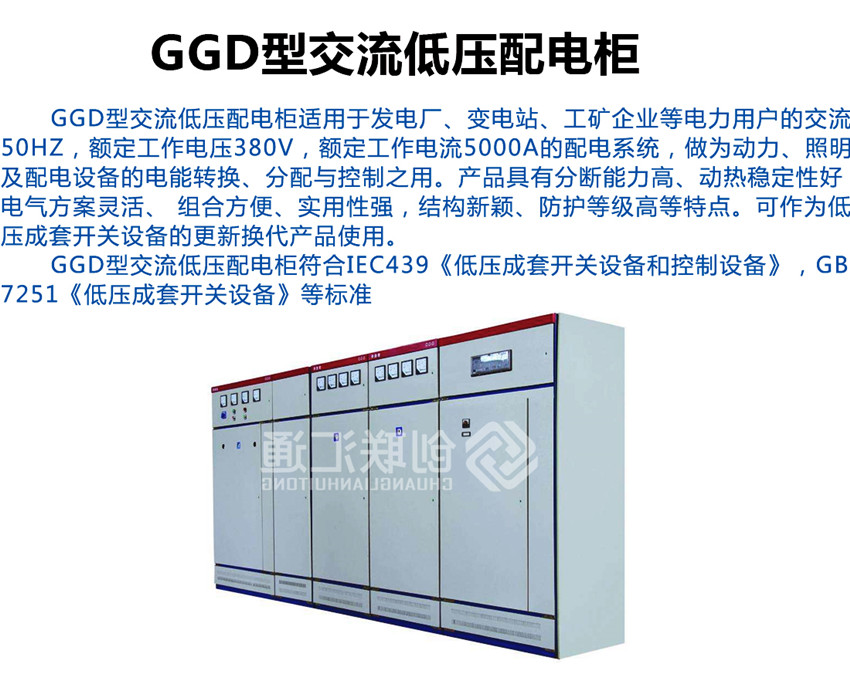 GGD型交流低压配电柜是根据能源部主管上级,广大电力用户及设计部门的要求,本着安全、经济、合理、可靠的原则设计的新型配电柜。产品具有分断能力高,动热稳定性好,电气方案灵活、组合方便,系列性、实用性强,结构新颖、防护等级高等特点,可以作低压成套开关设备的更新换代产品使用。并且广泛适用于发电厂、变电所、工业企业等电力用户作为交流50HZ,额定工作电压380V,额定电流至3150A 的配电系统中作为动力,照明及配电设备的电能转换、分配与控制之用。该产品分断能力高,额定短结构新颖等特点。该产品是我组装式、固定面板开关柜的代表产品之一。