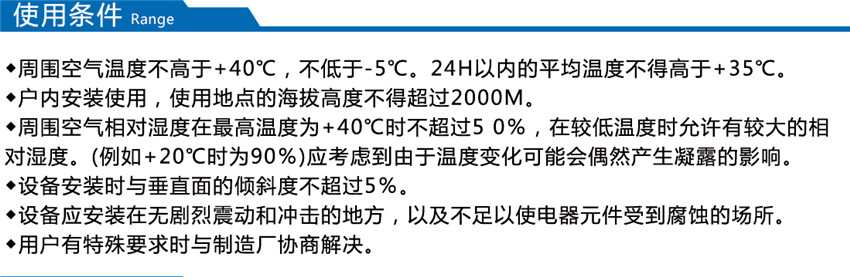 1、周围空气相对湿度在最高温度为+40℃时不超过50%,在较低温度时允许有较大的相对湿度。(例如+20℃时为90%)应考虑到由于温度的变化可能会偶然产生凝露的影响;