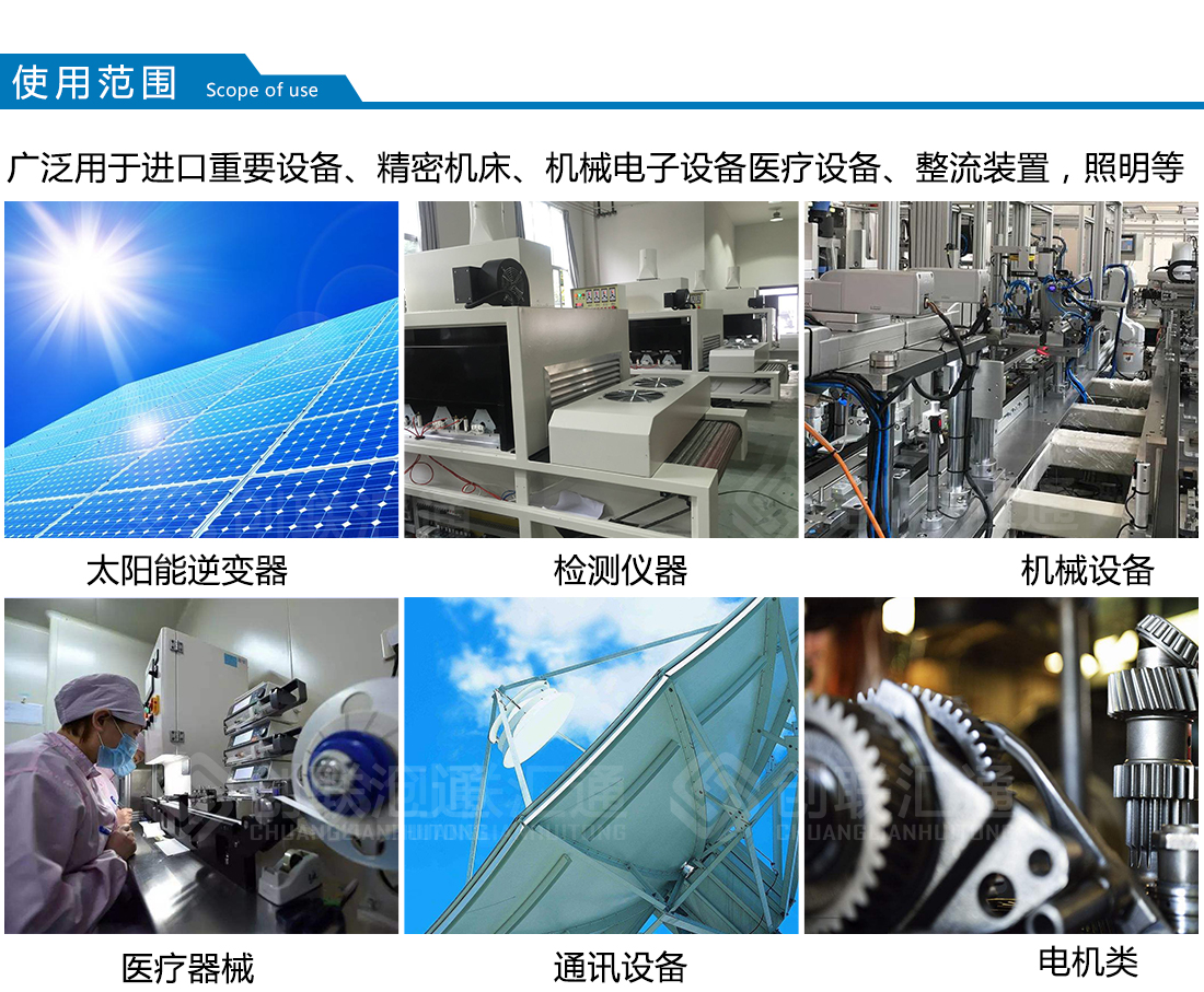 广泛用于进口重要设备、机密机床、机械电子设备、医疗设备、整流装置、照明等,安装场所应无严重影响变压器绝缘强度的气体,蒸汽,化学性沉积,污垢,导电尘埃及无其他易爆易燃易腐蚀的物质。