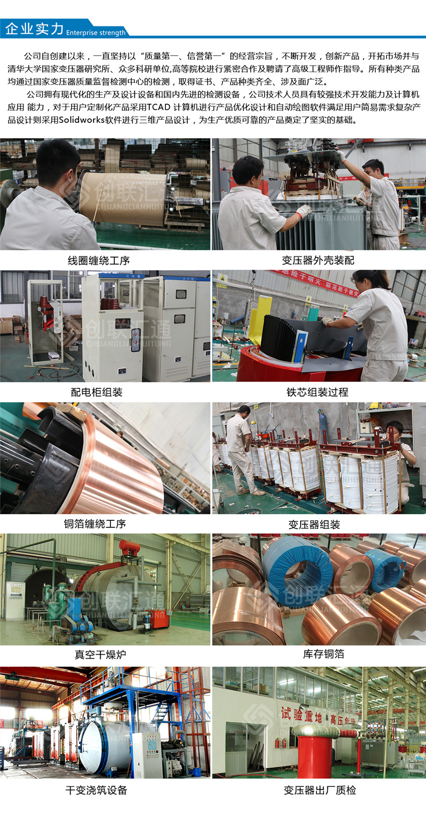 高压绕组用带填料环氧树脂真空浇注,局放量小,线圈电气强度高,绕内外壁用玻璃纤维网络格板增强,增加了线圈的机械强度,提高了产品抗突短路的能力,线圈永不开裂。
