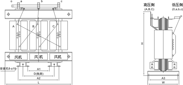 注:容量200kVA及以下不带风机,否则在订货时需阐明。本表之外的规格和特殊要求可联系洽谈。