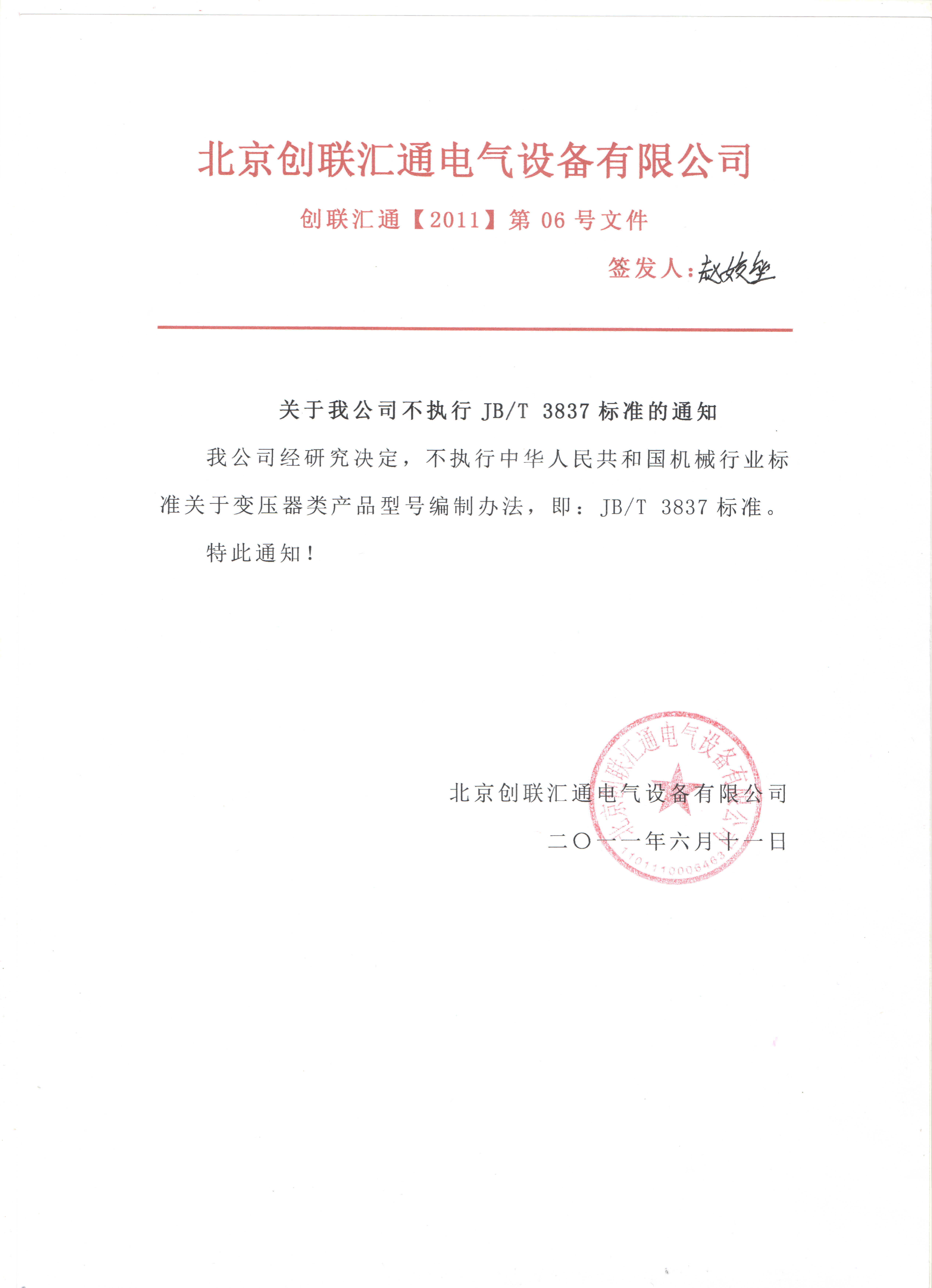 我公司经研究决定,不执行中华人民共和国机械行业标准关于变压器类产品型号编制办法,即:JB/T 3837标准。