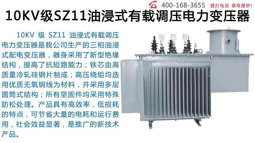 10KV级SZ11(13)-200~2500KVA油浸式配电有载调压电力变压器采用我厂自行开发研制的FL带在线滤油有载分接开关,在开关切换后,能自动过滤开关油室里的绝缘油,有效去除游离碳和杂质,提高绝缘强度。变压器具有运行安全可靠、环保节能、过载能力强、免维护等优点,壳体采用喷塑工艺,抗腐蚀、抗老化,设计先进、结构合理、外形美观、主要性能指标均优于家标准。