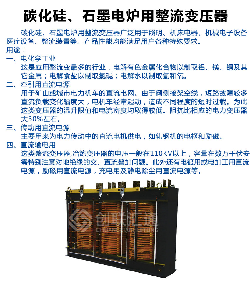 碳化硅、石墨电炉用整流变压器广泛用于照明、机床电器、机械电子设备、医疗设备、整流装置等。产品性能均能满足用户各种特殊要求。