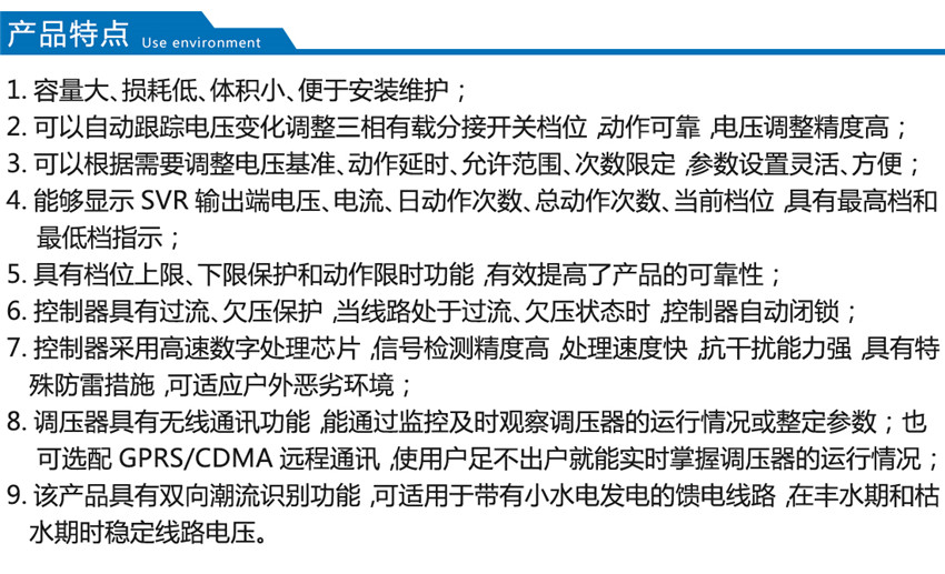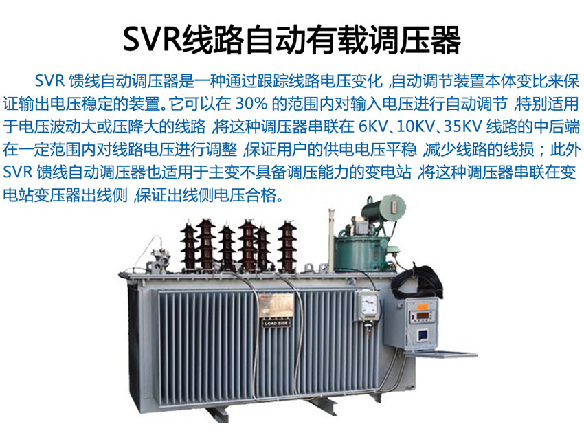 我公司生产的SVR型线路自动调压变压器原理是SVR与10kV 柱上无功自动补偿装置GWJ配合使用,可有效地解决线路电压低及无功电源不足的问题。SVR 能有效地调节电路电压, GWJ无功补偿装置能有效补偿无功,提高功率因数,降低线损,其效果相当于一个简易的柱上变电站,而造价仅为常规变电站的1/6~1/10。而成本只有变电站的1/6,1/7,而且无需工作人员值班维护。
