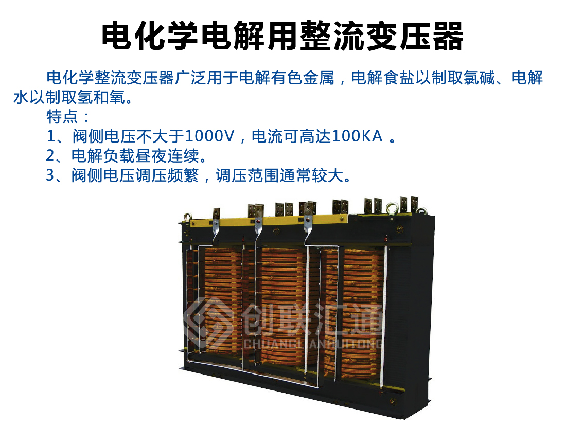 广泛应用于电化学工业,这是应用整流变最多的行业,电解有色金属化合物以制取铝、镁、铜及其它金属;电解食盐以制取氯碱;电解水以制取氢和氧等领域。