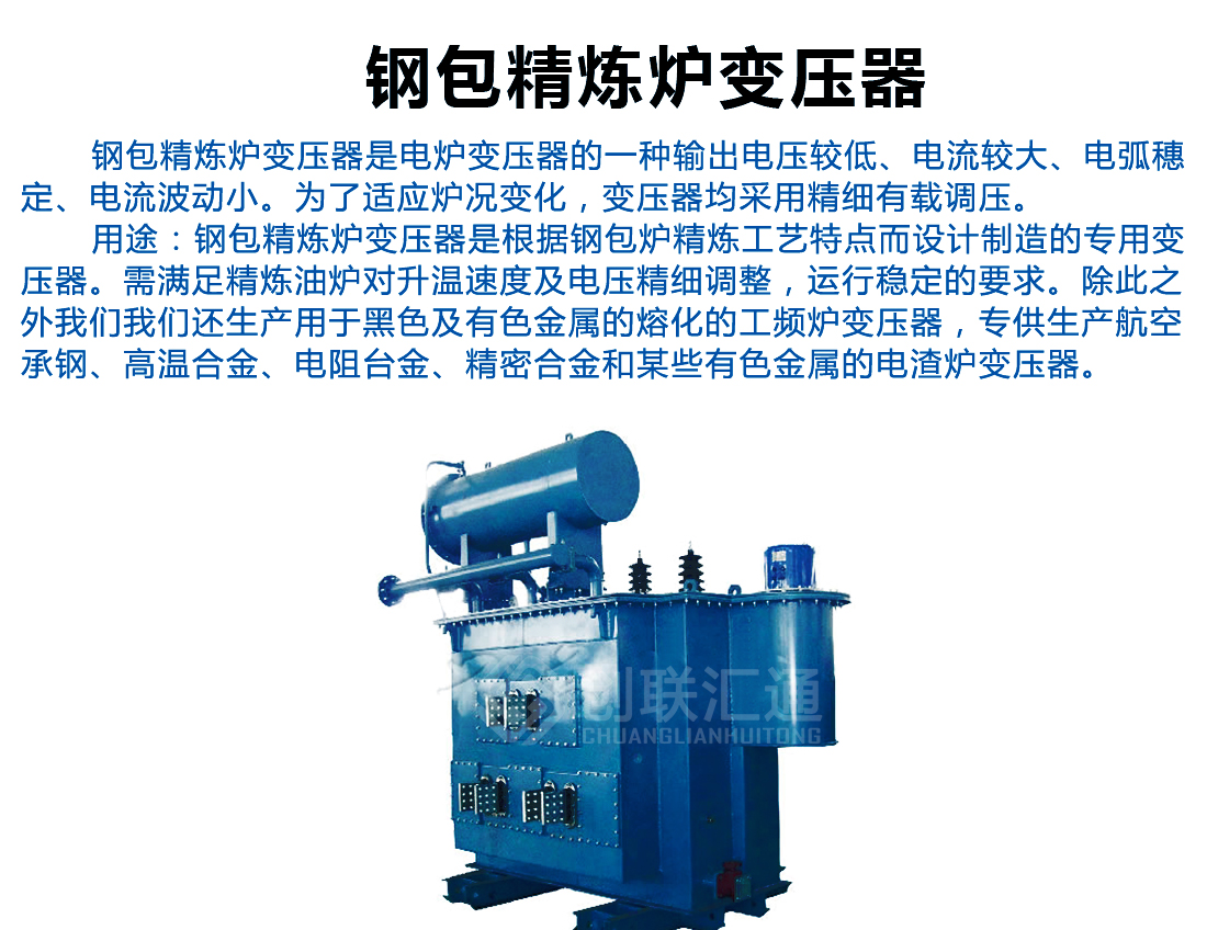 钢包精炼炉变压器是根据钢包炉精炼工艺特点而设计制造的专用变压器。需满足精炼油炉对升温速度及电压精细调整,运行稳定的要求。除此之外创联汇通电气还生产用于黑色及有色金属的熔化的工频炉变压器,专供生产航空承钢、高温合金、电阻台金、精密合金和某些有色金属的电渣炉变压器。