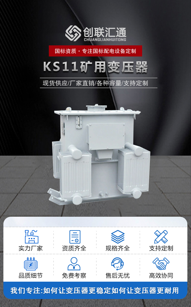 KS11系列10KV矿用变压器KS11系列矿用变压器,作为矿并的配电设备.该产品具有体积小,易下并,结构合理、损耗低.教热性能好等特点。本系列产品采用优质的晶粒取向优质高导磁性能硅钢片叠装而成,铁芯为芯式铁芯,全斜接缝迭积式铁芯,其铁芯柱为多级圆截面,确保低噪音低损耗油箱结构坚固,箱壁两侧焊有高、低压电缆接线盒,作为电缆接线之用,高压线圈须有额定电压士5