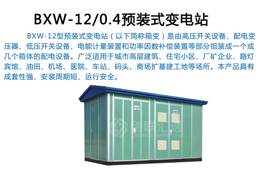 BXW-12型预装式变电站(以下简称箱变)是由高压开关设备、配电变压器、低压开关设备、电能计量装置和功率因数补偿装置等部分组装成一个或几个箱体的配电设备。广泛适用于城市高层建筑、住宅小区、厂矿企业、路灯、宾馆、油田、机场、医院、车站、码头、商场扩基建工地等场所。本产品具有成套性强、安装周期短、运行安全