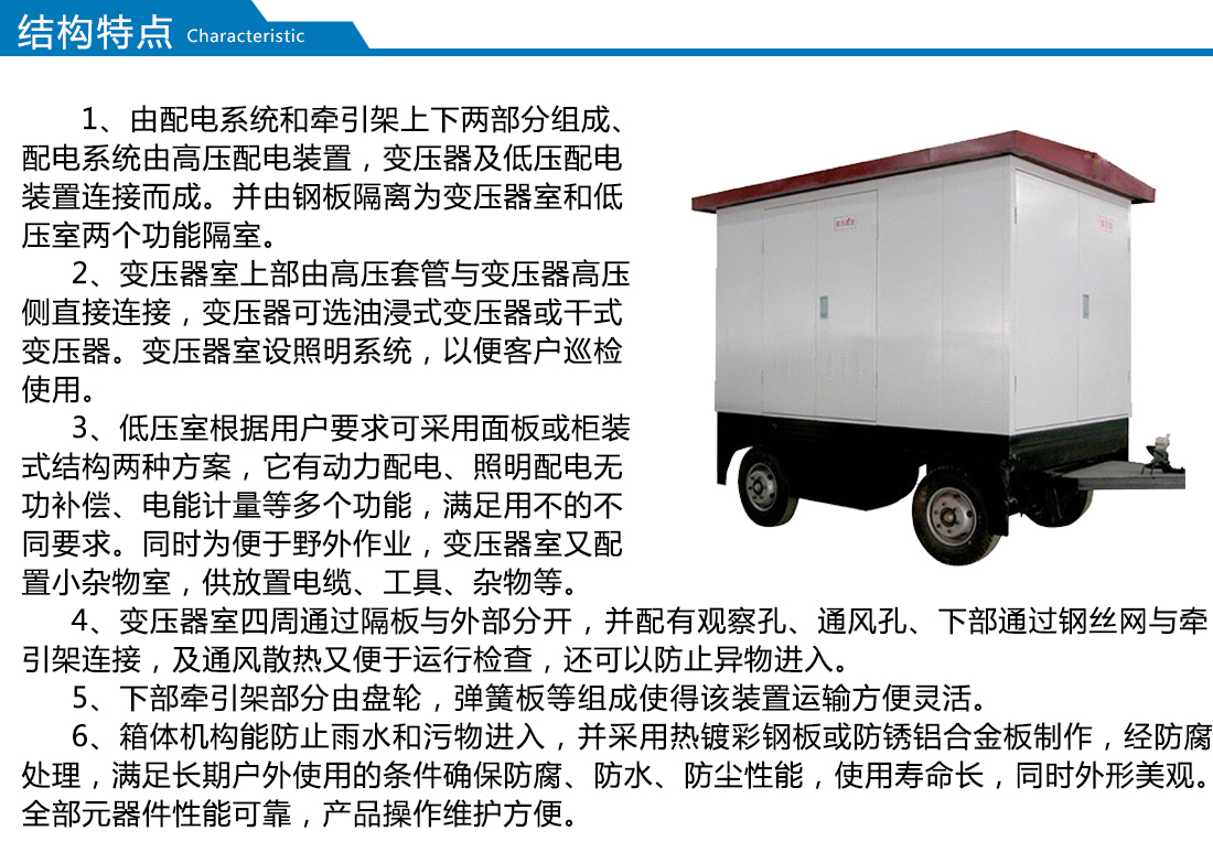 移动式箱式变电站产品为全密封、全绝缘结构,人身安全得到可靠保证,体积小,结构紧凑(该产品占地仅为同容量欧式箱变的1/3),安装方便灵活,既可用于环网,又可用于终端,转换方便,大大提高供电可靠性。