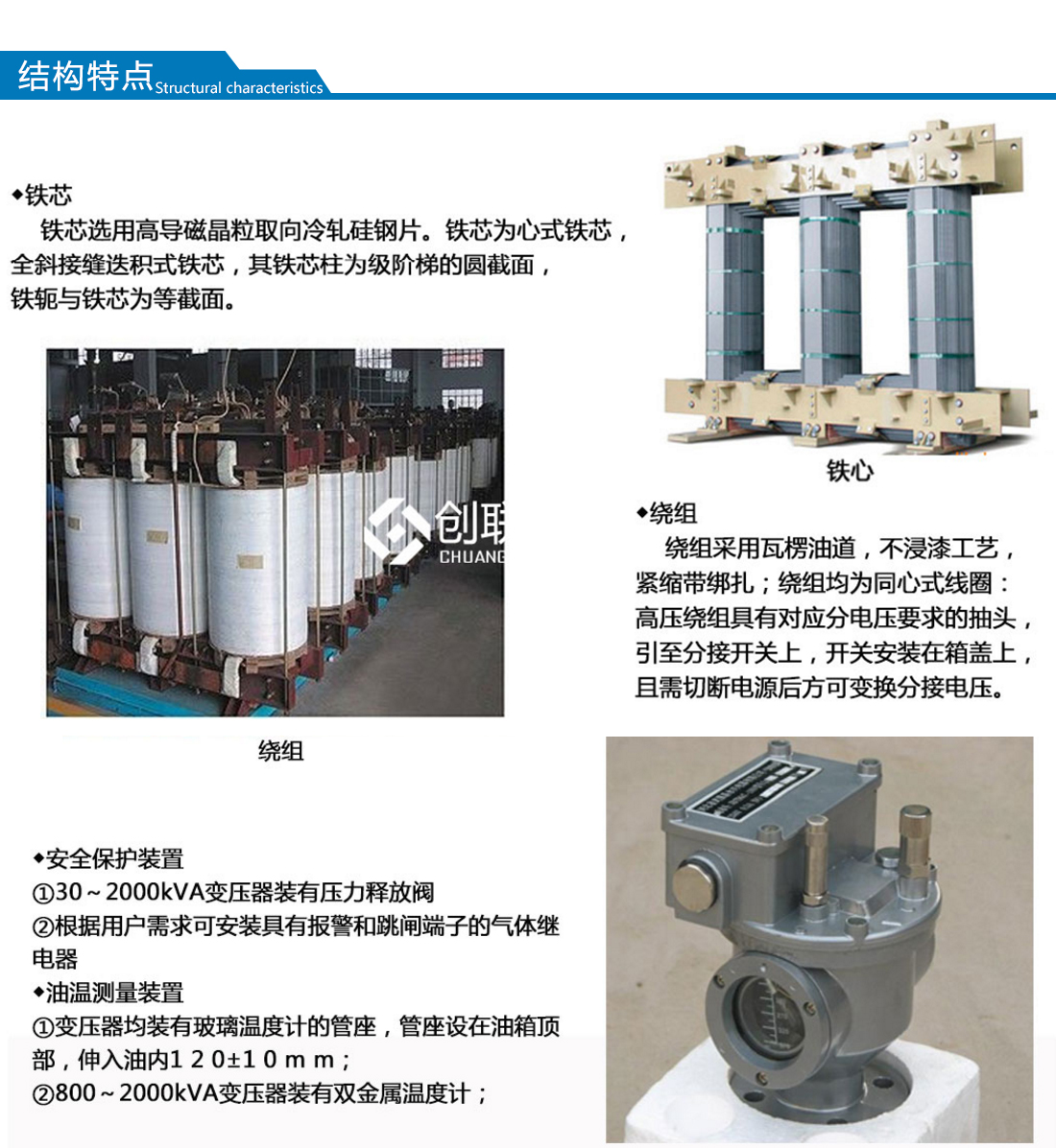 b、铁心和绕组各自采用了紧固措施,器身高、低压引线等紧固部分都带自锁防松螺母,采用了不吊心结构,能承受运输的颠震。