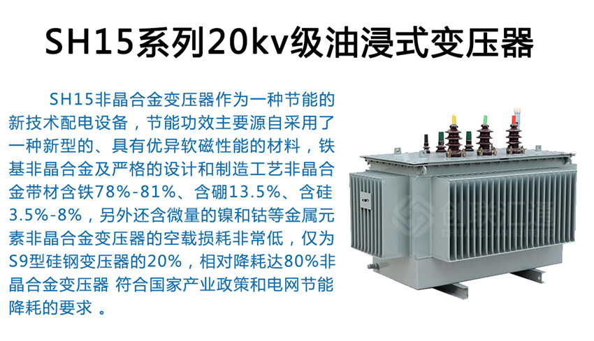非晶合金变压器SH15-800/10-0.4作为一种节能的新技术配电设备,节能功效主要源自采用了一种新型的、具有优异软磁性能的材料,铁基非晶合金及严格的设计和制造工艺非晶合金带材含铁78%-81%、含硼13.5%、含硅3.5%-8%,另外还含微量的镍和钴等金属元素非晶合金变压器的空载损耗非常低,仅为S9型硅钢变压器的20%,相对降耗达80%非晶合金变压器 符合家产业政策和电网节能降耗的要求 。