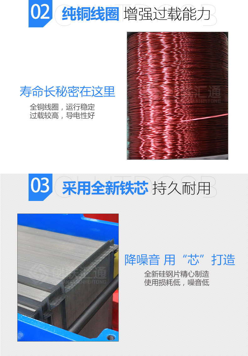 1.变压器铁芯采用进口 冷轧硅钢片叠积而成,大大降低空载和空载电流,并对铁芯进行绑扎,保证铁芯的紧实度,降低噪音。