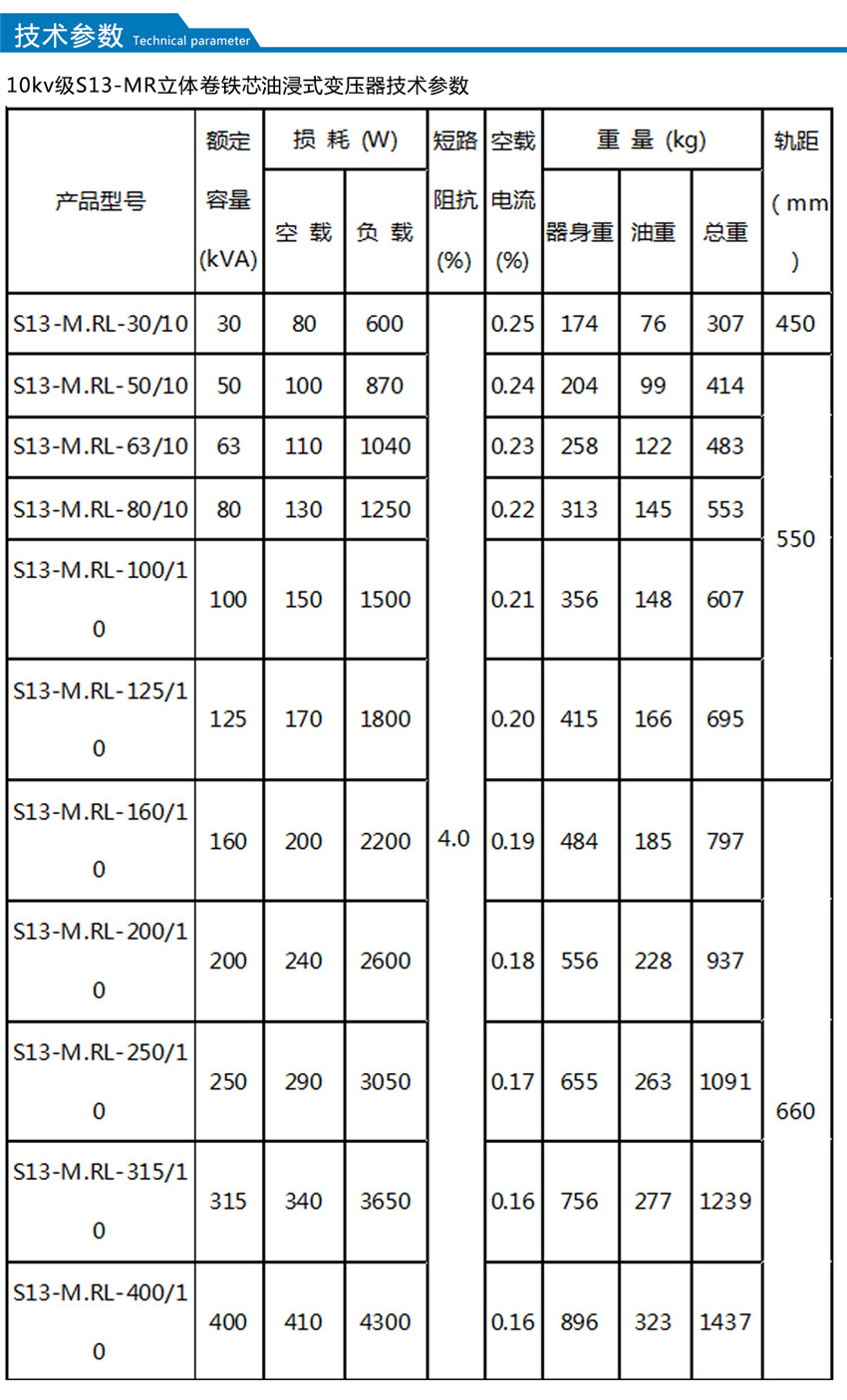 . S11-M.RL-/10-20 、S13-M.RL-/10-20 立体三角形卷铁心变压器有10kV 及20kV 两种电压兼容的产品系列,在10kV 电网向20kV电网过渡更新时期.极大的方便了用户。