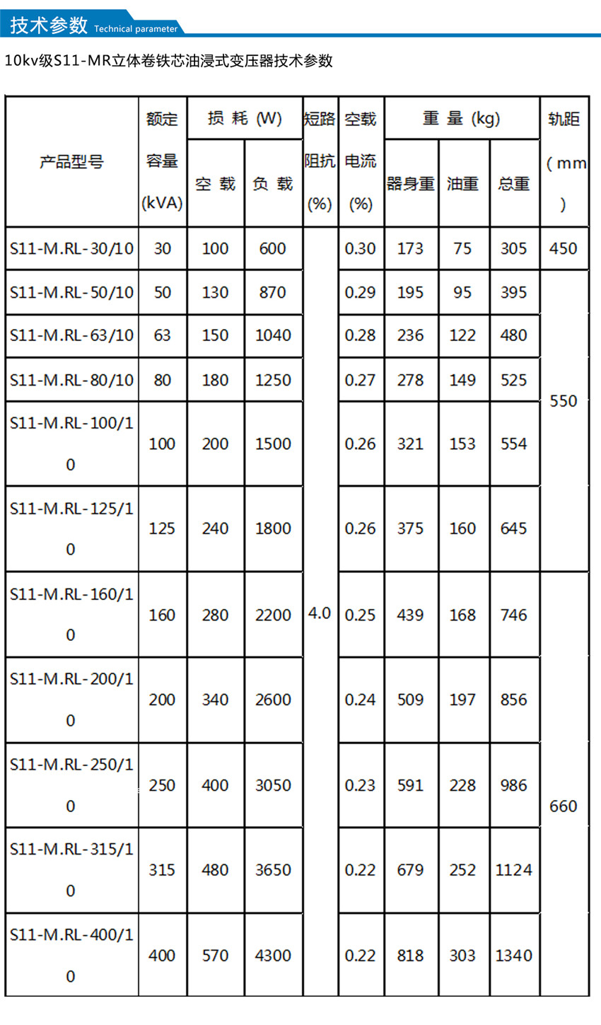 . S11-M.RL-/10-20 、S13-M.RL-/10-20 立体三角形卷铁心变压器有10kV 及20kV 两种电压兼容的产品系列,在10kV 电网向20kV电网过渡更新时期.极大的方便了用户。
