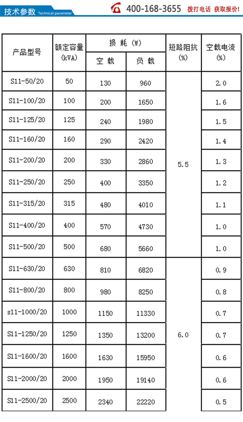 S11系列产品在S9系列的基础上,空载损耗平均降低了30%;空载电流比S9下降70-85%;平均温升降低10K,产品使用寿命增加一倍多,即使在超负载20%的条件下仍可长期运行;产品运行噪音平均降低2-4分贝。